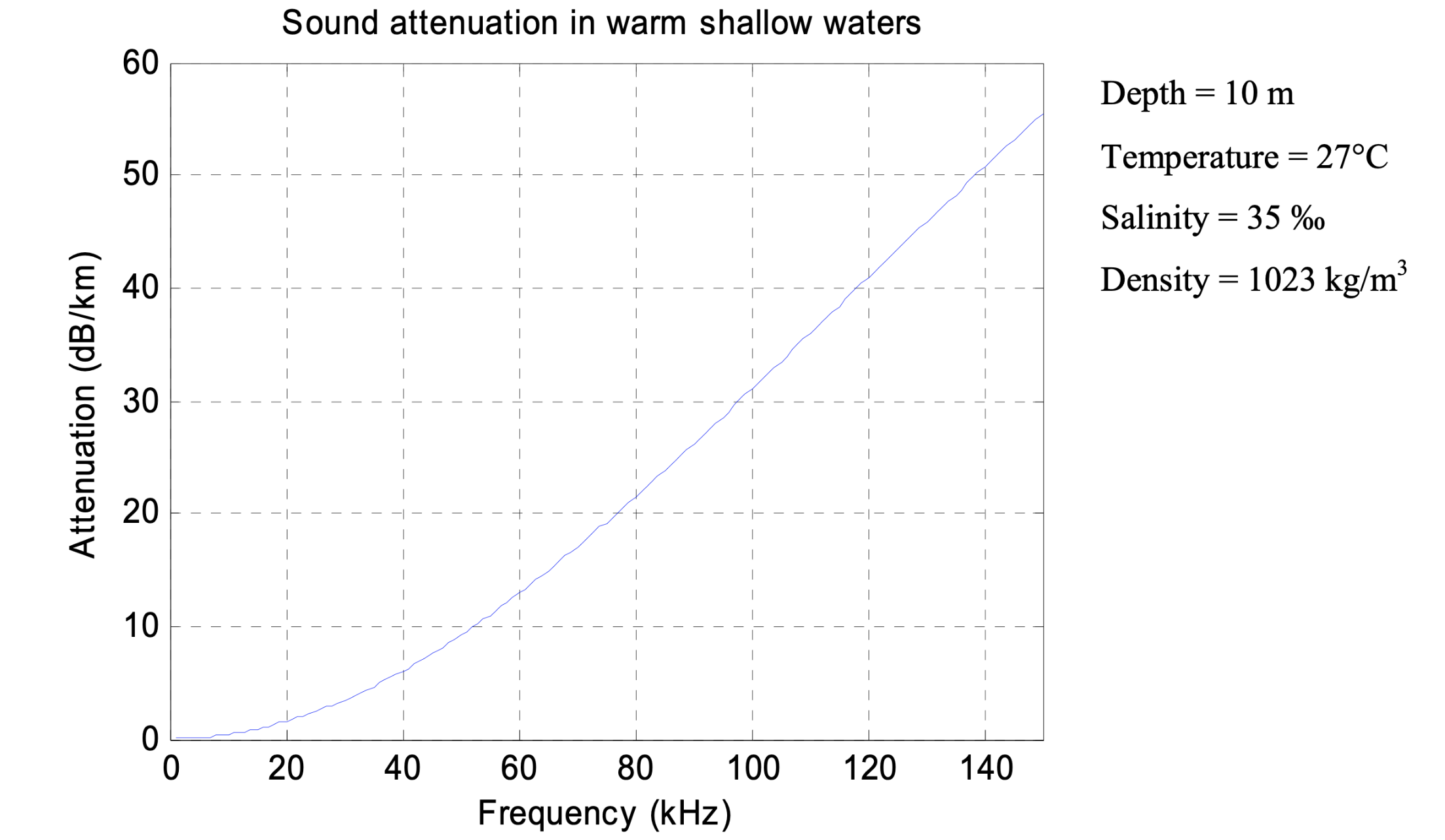 Before you even build or buy, the technology choices you make set the upper bound for what your system can achieve. The first and most important is the frequency band. Higher frequencies in the hundreds of kiloHertz give you short-range but high-rate links, suitable for a few hundred meters and applications like image or file transfer. Mid-range frequencies in the tens of kiloHertz are the workhorse for kilometre-scale missions. At the other end, only a few kiloHertz will carry over tens of kilometres, but at the cost of data rate. Every choice is a trade-off between absorption, ambient noise, and usable bandwidth, so you need to pick the sweet spot that matches your mission profile. As shown in Figure 1, sound attenuation in warm shallow waters increases steeply with frequency. This relationship is what drives the trade-off between range and data rate when selecting an operating band.