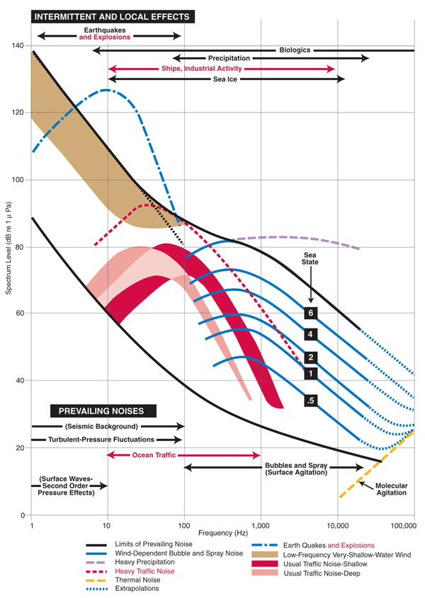 Figure 2: The typical sound levels of ocean background noises at different frequencies, as measured by Wenz (1962). This graph is therefore also referred to as the Wenz curves. The sound levels are given in underwater dB summed over 1 Hz wide frequency bands, which is often written as dB re 1 µPa2/Hz. Adapted (after National Research Council, 2003) from Wenz, G. M. (1962). Acoustic ambient noise in the ocean: Spectra and sources. The Journal of the Acoustical Society of America, 34(12), 1936–1956.